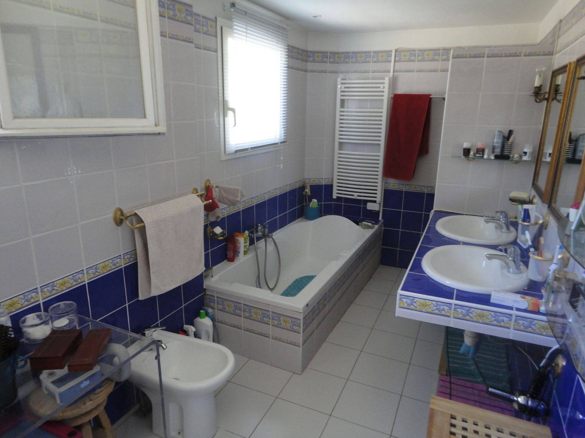 Vue dominante, au calme, très belle maison sur deux niveaux comprenant au rez-de-chaussée un espace de vie de 65 m² avec cuisine ouverte donnant sur une grande piscine, une chambre avec salle d'eau et WC.