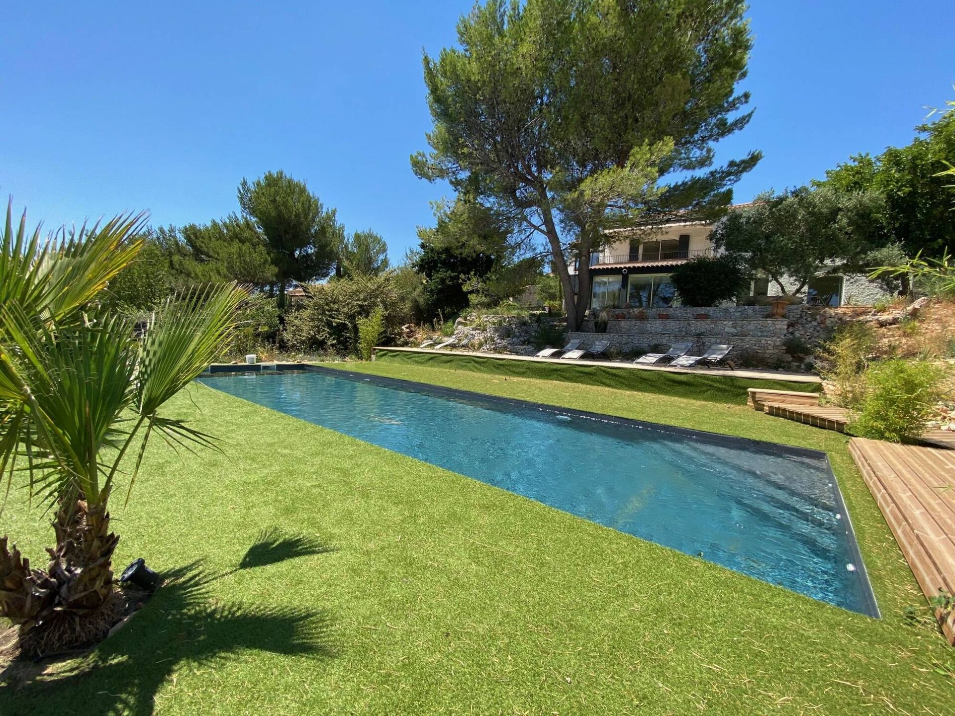 piscine et belles terrasses en bois.